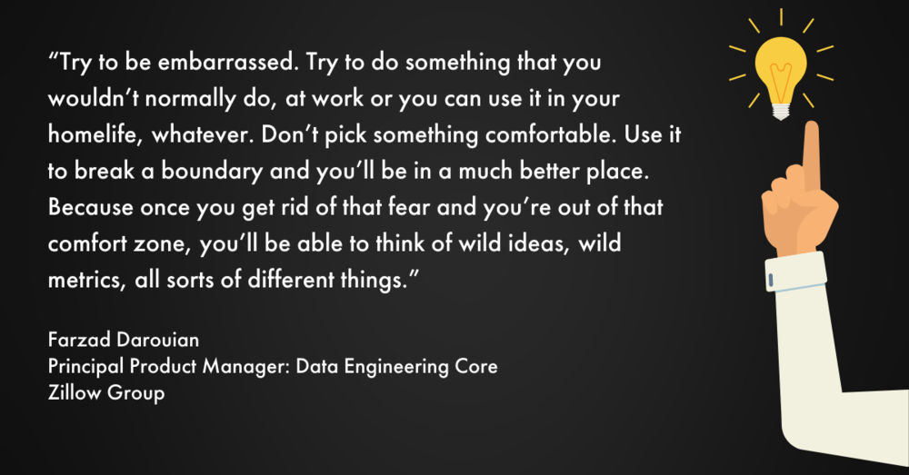 “Try to be embarrassed. Try to do something that you wouldn’t normally do, at work or you can use it in your home life, whatever. Don’t pick something comfortable. Use it to break a boundary and you’ll be in a much better place. Because once you get rid of that fear and you’re out of that comfort zone, you’ll be able to think of wild ideas, wild metrics, all sorts of different things.”