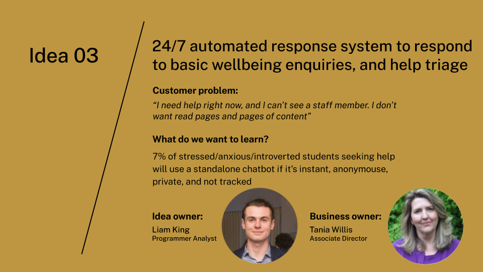 One of the most high-value ideas discovered during the ideation phase was a chatbot that would assist students to find the information and resources they need to improve their wellbeing. “This was something with a bit of potential, and if it worked it would be a huge weight off the student body’s shoulders, as well as the administration.”