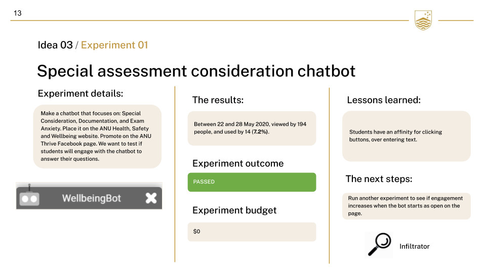 By using pretotyping, the EA team was able to comprehensively gather the data and develop the use case for a chatbot, allowing ANU to be confident that pouring time, money, and resources into developing the idea is a solid investment that will improve student wellbeing.